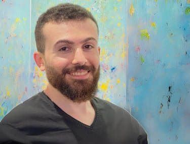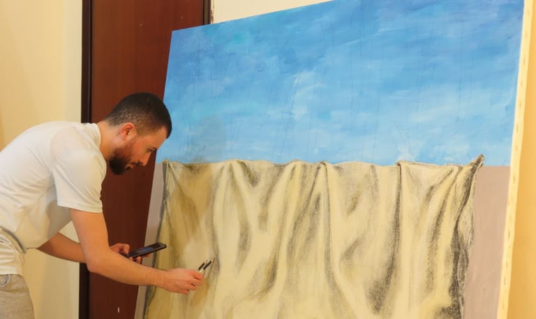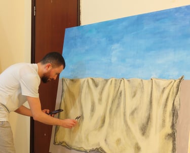 Rakan Khzam is a Syrian artist born in Homs in 1991. He grew up and completed his early education in Homs before moving to Damascus to pursue his studies at Damascus University. He graduated in 2014 with a Bachelor's degree in Fine Arts, specializing in Interior Architecture. His background in interior architecture is distinctly reflected in his paintings, which are characterized by geometric patterns and architectural forms...