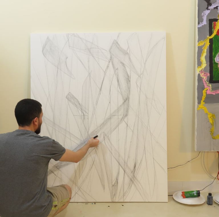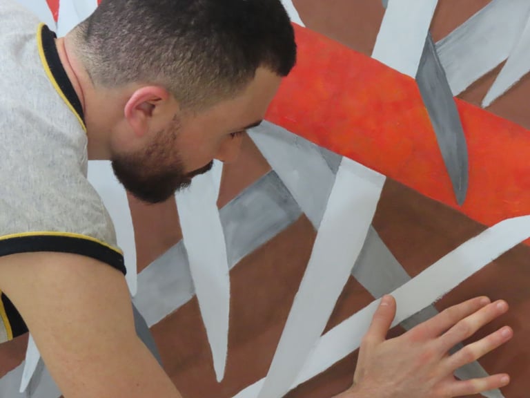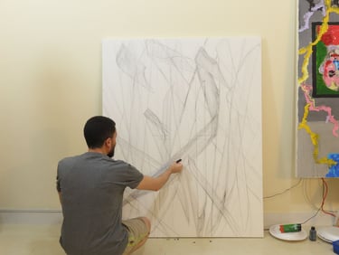 Rakan Khzam’s artistic style is heavily influenced by his background in interior architecture, as seen in the structured compositions and geometric elements that define his work. His art explores the relationship between the human psyche and architectural forms, drawing parallels between emotions and structural elements such as domes, columns, arches, and angles. These forms, whether appearing rigid or delicate, embody an innate strength and beauty through their ability to endure.